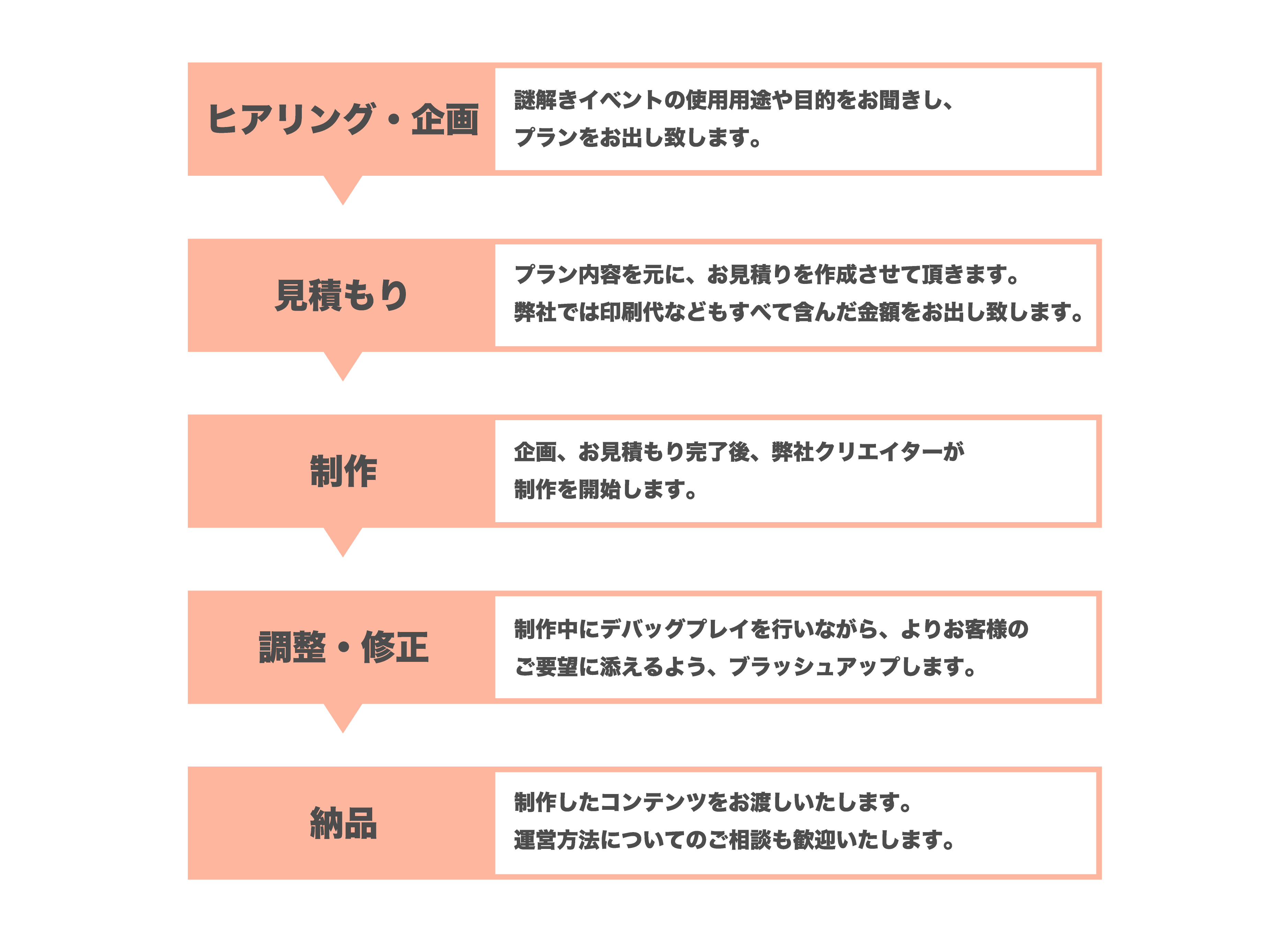 自社で謎解き店舗を構えている会社は多くはありません。我々は常に謎解きファンの熱量を受け止め、熱狂させ、支持されて今があります。謎解きのクオリティをお求めでしたら是非弊社にご連絡ください。謎解き開催のほか、製品やサービスのプロモーション、社内研修やチームビルディング、ウェディング、子供向けの教育素材など、様々な場面で謎解きを制作させて頂きます。